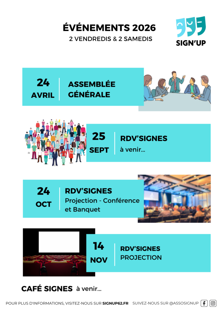 Notez dans vos agendas que l’assemblée générale ordinaire de SIGN’UP aura lieu le vendredi 24 avril 2026 à 18 h.Les informations complémentaires seront communiquées prochainement.